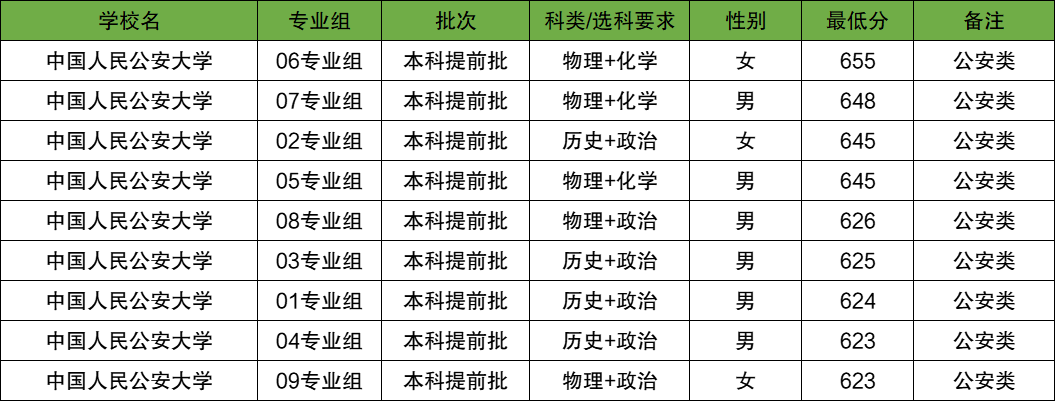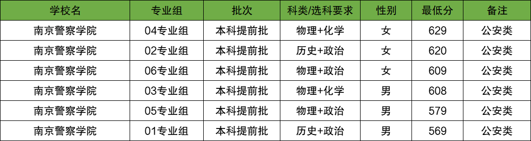 2025年该校公安类专业在江苏提前批招生分数中,女生分数最高的是06专业组,2025年最低录取分为655分;女生分数最低的是09专业组,2025年最低录取分为623分。