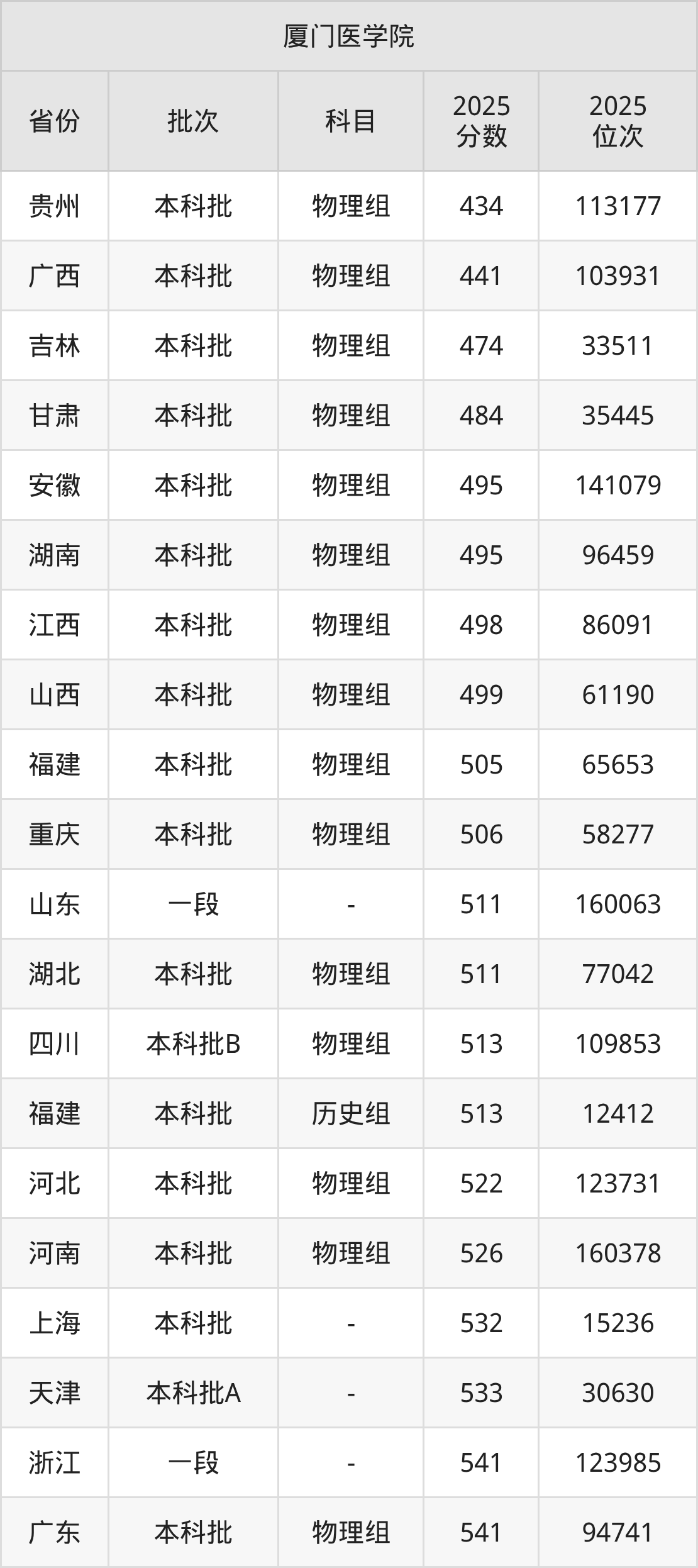 在贵州本科批物理组,厦门医学院的最低分是434、最低录取位次是113177名。在广西本科批物理组,厦门医学院的最低分是441、最低录取位次是103931名。