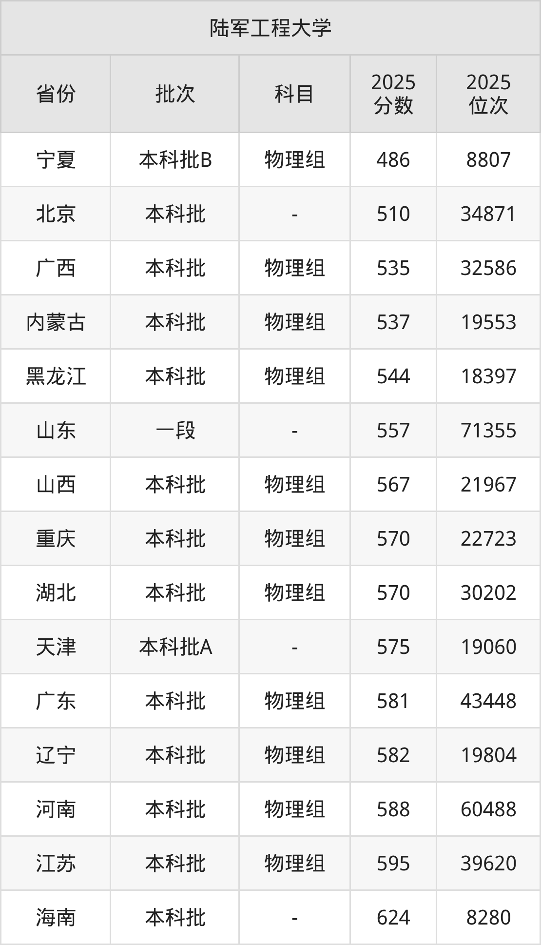 圆梦小编为2026届想要报考陆军工程大学的同学整理了:陆军工程大学2025年在全国15个省的最低分及录取位次。