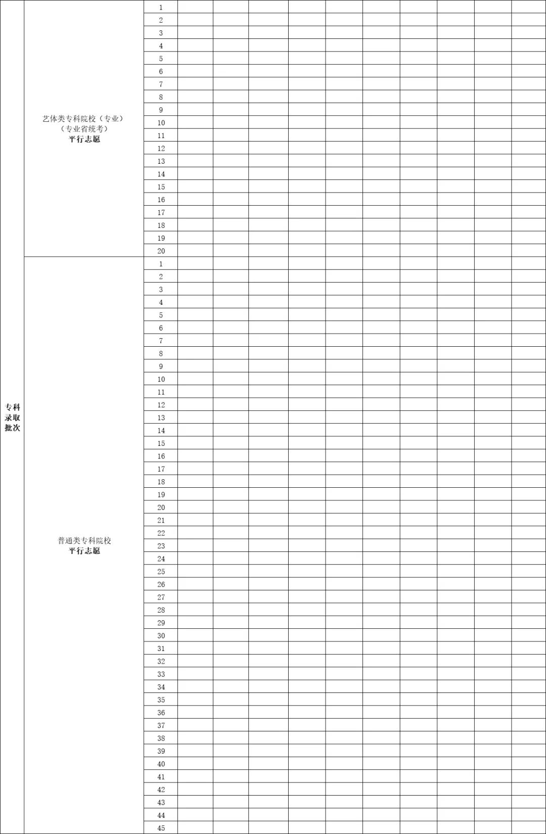 艺体类本科院校统考设20个平行志愿,不分文理。
