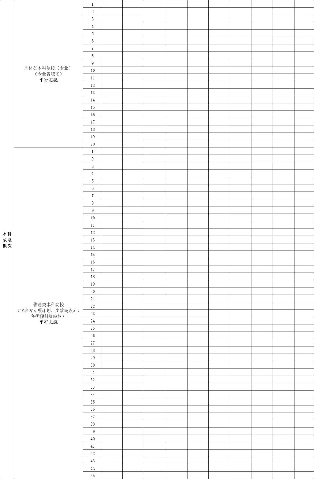 普通类本科院校(含地方专项计划、少数民族班、各类预科班)设45个平行志愿;
