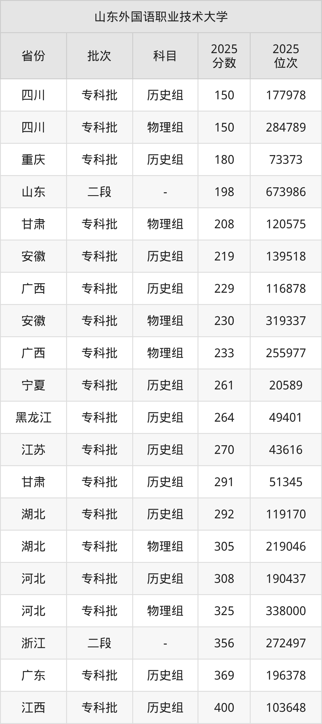 在四川专科批历史组,山东外国语职业技术大学的最低分是150、最低录取位次是177978名。在重庆专科批历史组,山东外国语职业技术大学的最低分是180、最低录取位次是73373名。