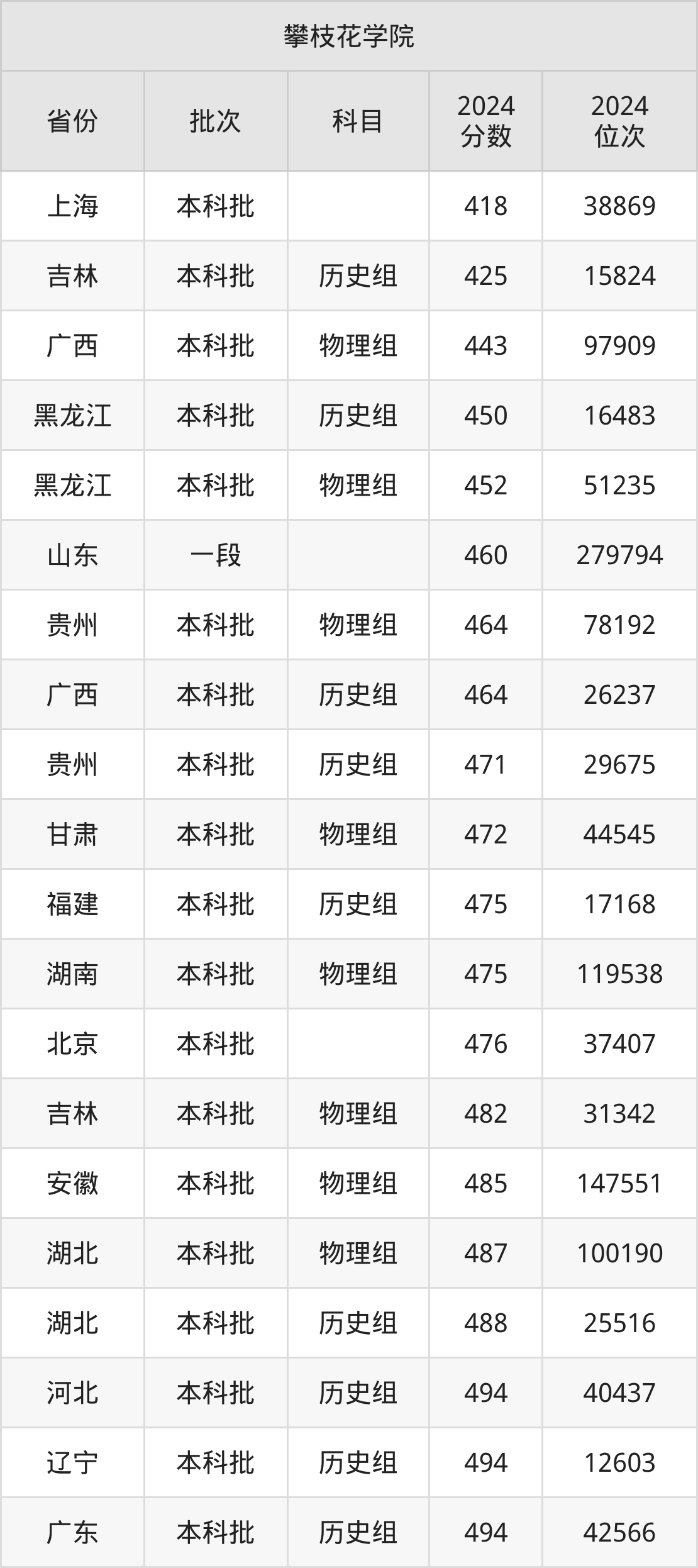 在上海本科批,攀枝花学院的最低分是418、最低录取位次是38869名。在吉林本科批历史组,攀枝花学院的最低分是425、最低录取位次是15824名。