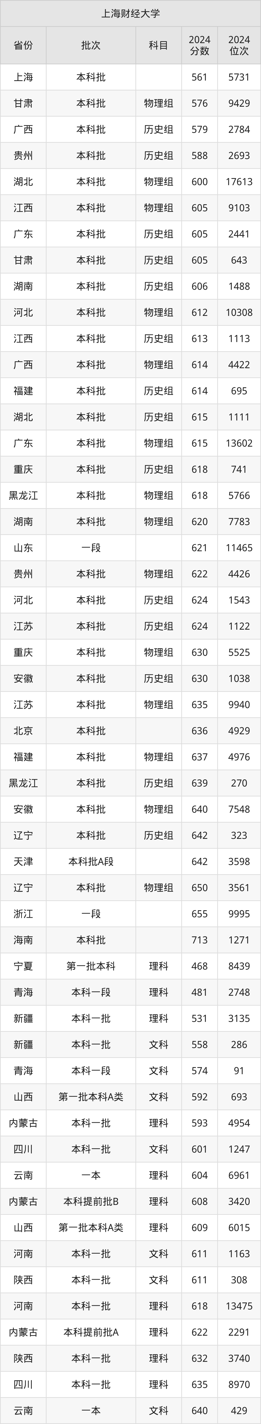 在上海本科批,上海财经大学的最低分是561、最低录取位次是5731名。在甘肃本科批物理组,上海财经大学的最低分是576、最低录取位次是9429名。