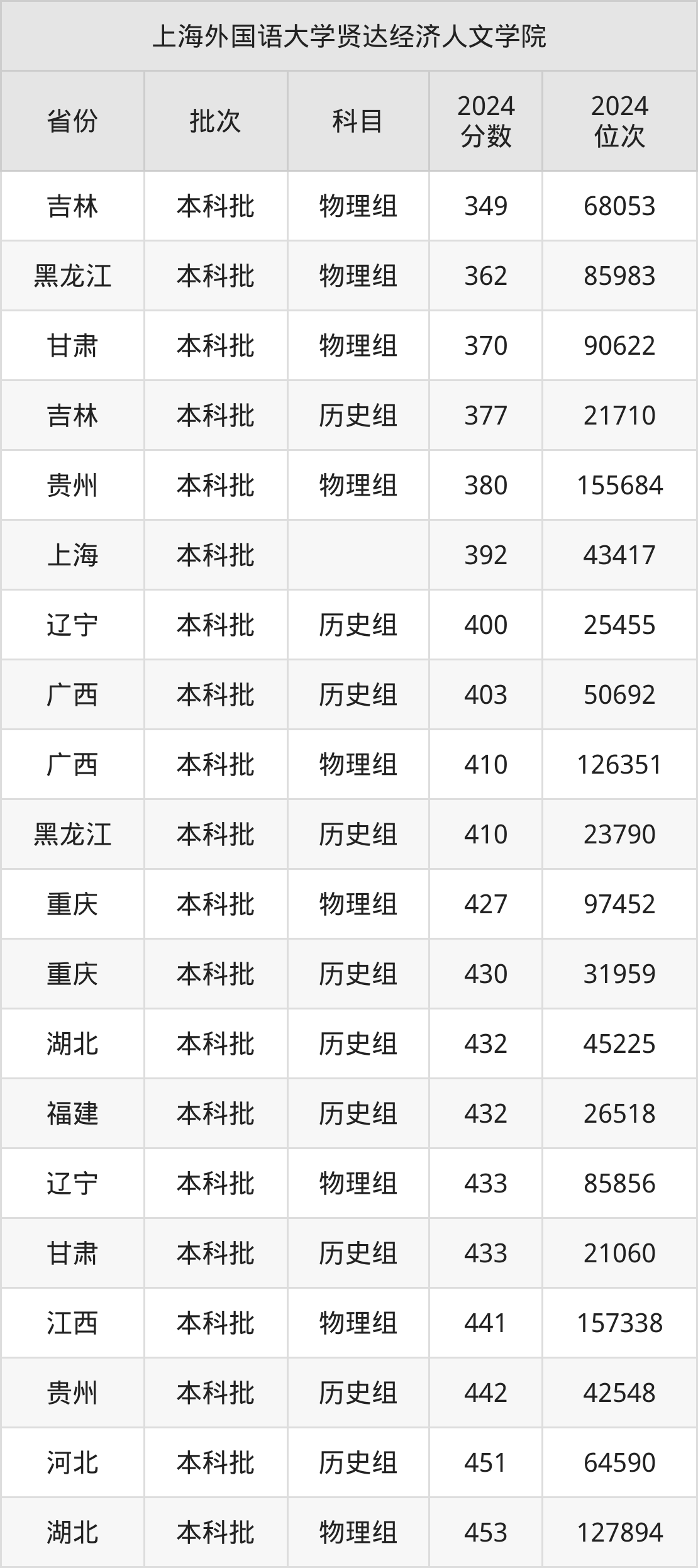 在吉林本科批物理组,上海外国语大学贤达经济人文学院的最低分是349、最低录取位次是68053名。在黑龙江本科批物理组,上海外国语大学贤达经济人文学院的最低分是362、最低录取位次是85983名。