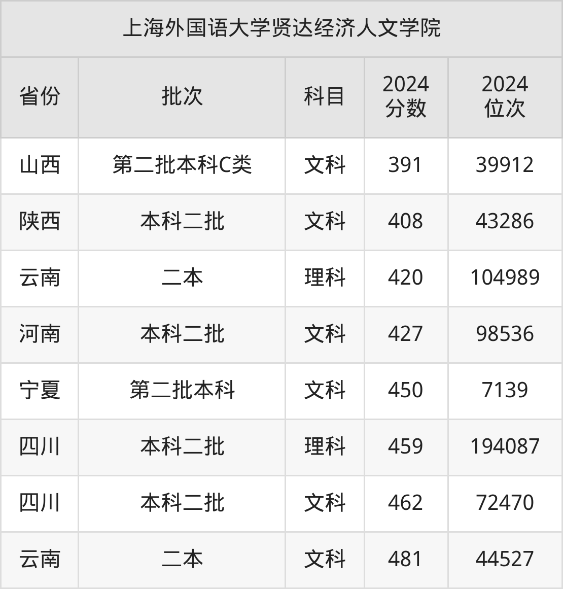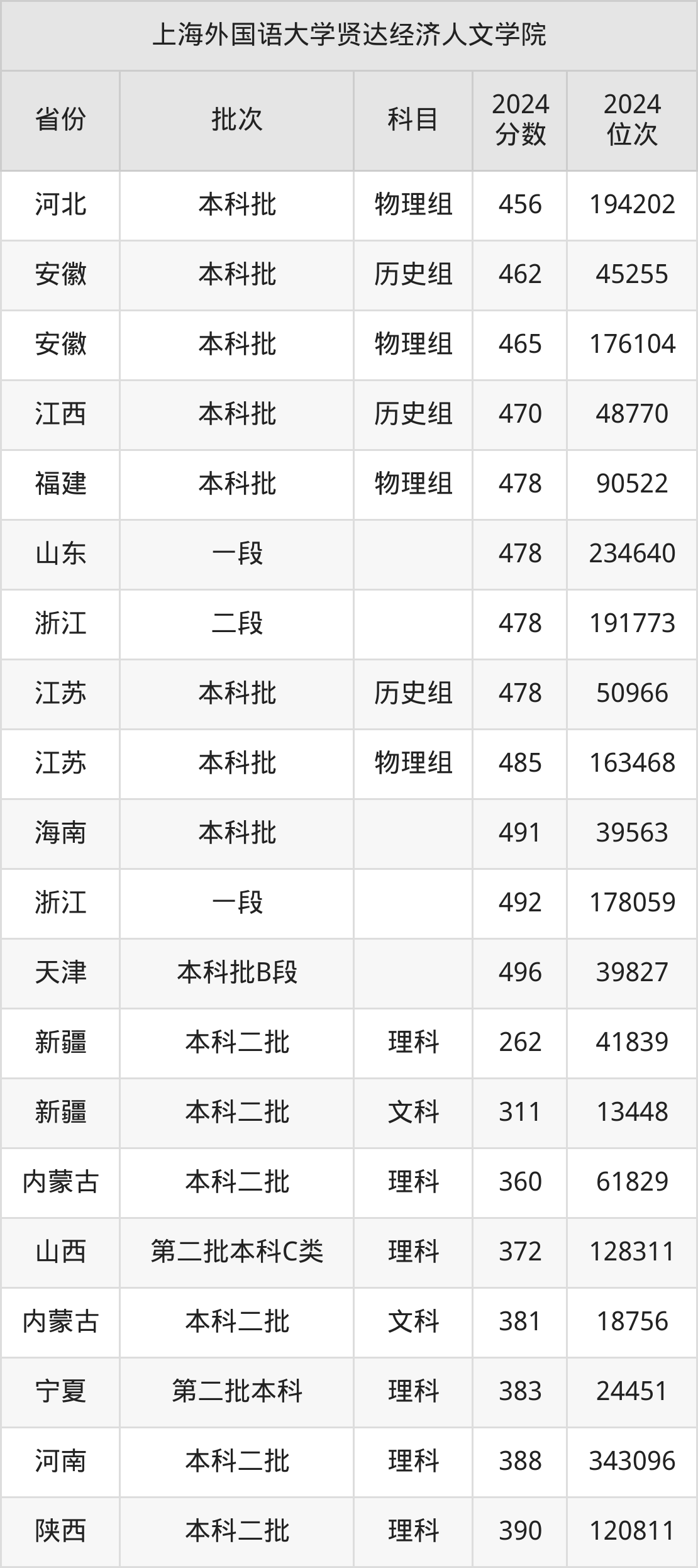 二、上海外国语大学贤达经济人文学院2024年录取分数线汇总