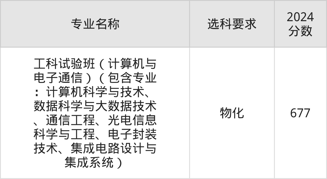 | 工科试验班(计算机与 电子通信)(包含专业 :计算机科学与技术、 数据科学与大数据技术 、通信工程、光电信息 科学与工程、电子封装 技术、集成电路设计与 集成系统) | 物化 | 665 |
