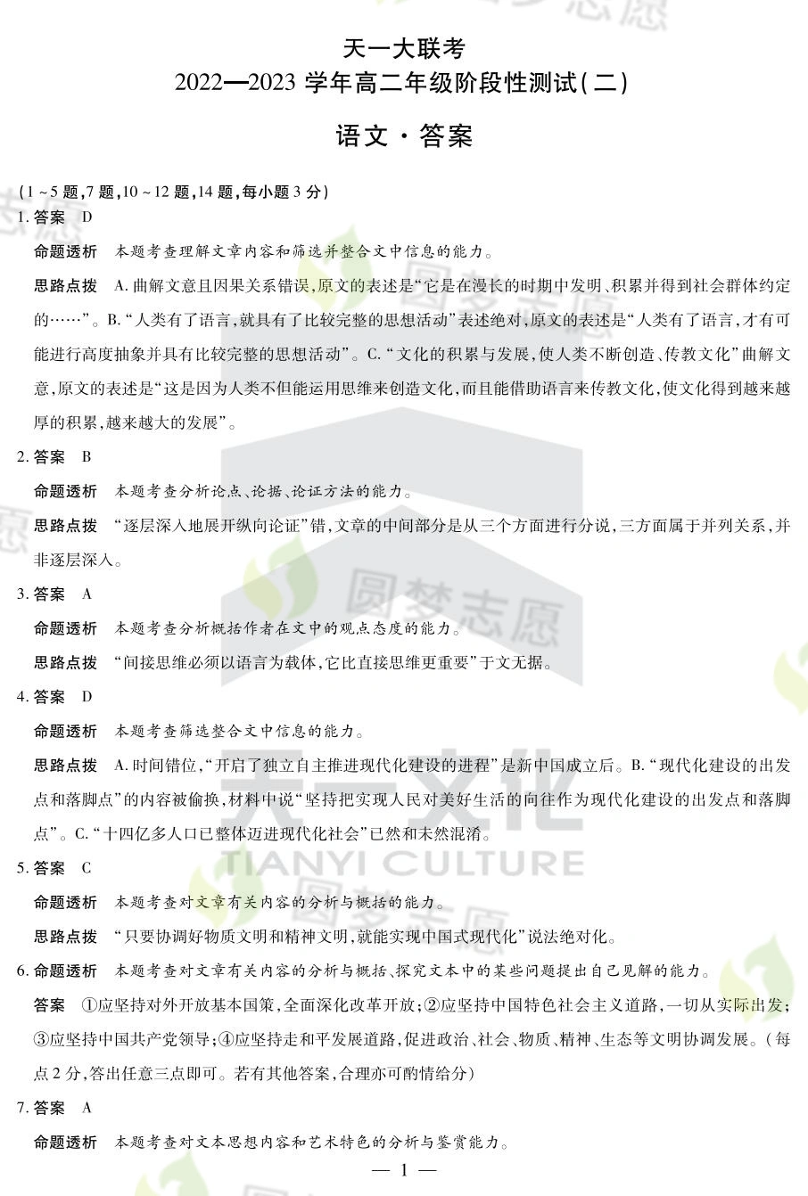 二、河南天一大联考2022-2023高二二联考试语文答案解析