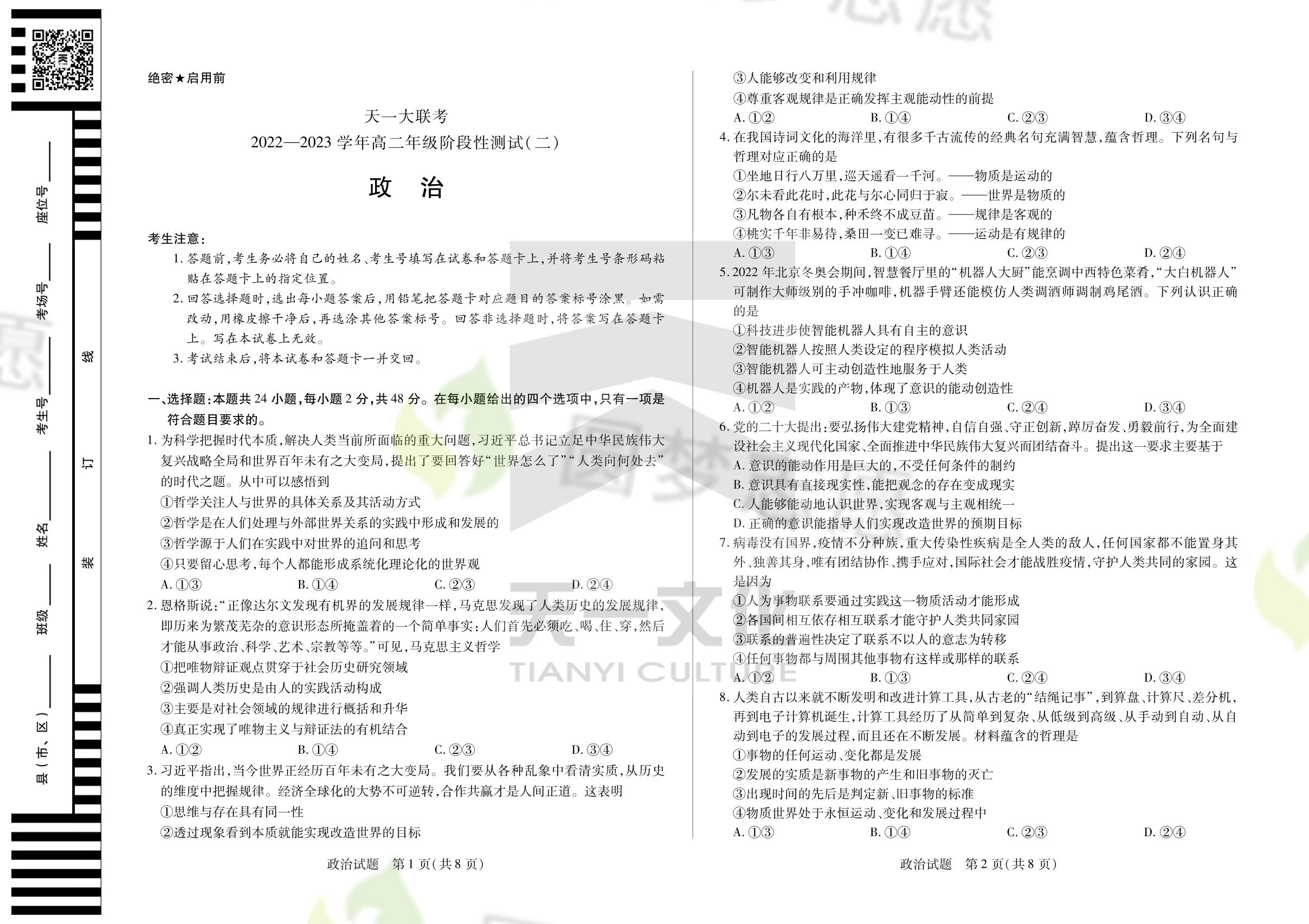 一、河南天一大联考2022-2023高二二联考试政治试卷