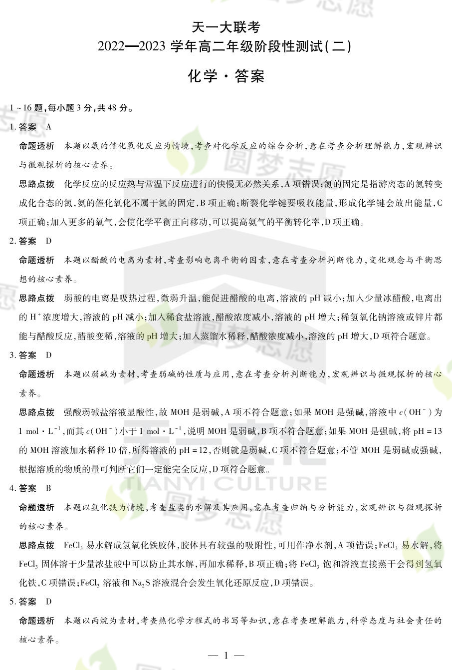 本文将公布天一大联考2022-2023高二二联化学答案及试卷汇总,请大家持续关注高考100网站。