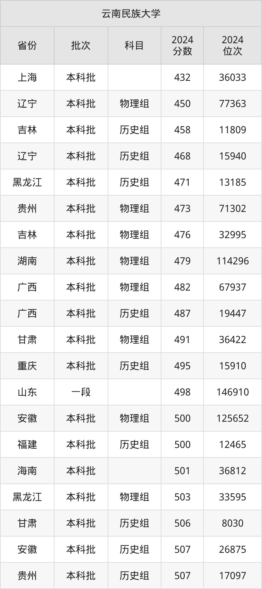 在上海本科批,云南民族大学的最低分是432、最低录取位次是36033名。在辽宁本科批物理组,云南民族大学的最低分是450、最低录取位次是77363名。