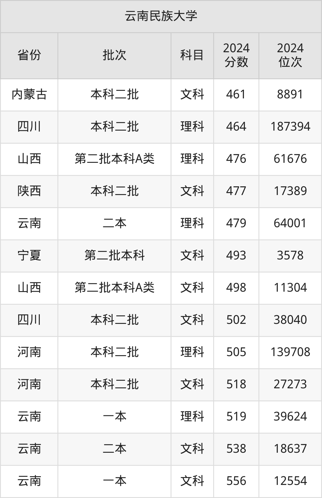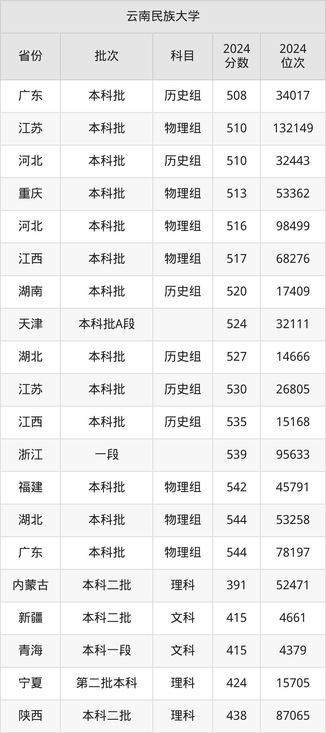 二、云南民族大学2024年录取分数线汇总