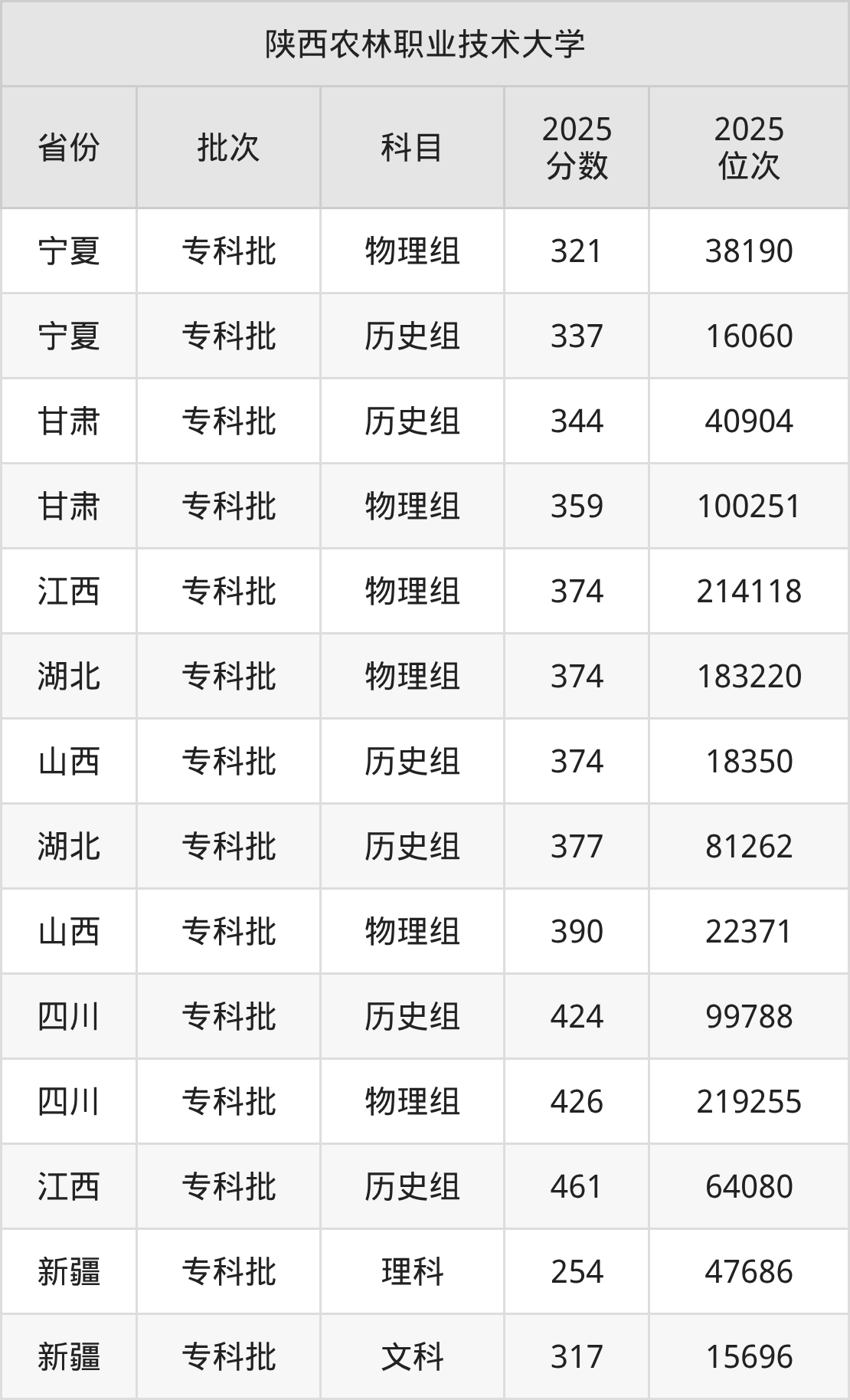 圆梦小编为2026届想要报考陕西农林职业技术大学的同学整理了:陕西农林职业技术大学2025年在全国7个省的最低分及录取位次。