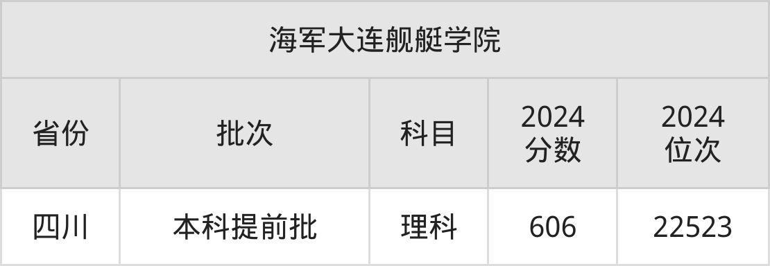 在四川本科提前批理科,海军大连舰艇学院的最低分是606、最低录取位次是22523名。