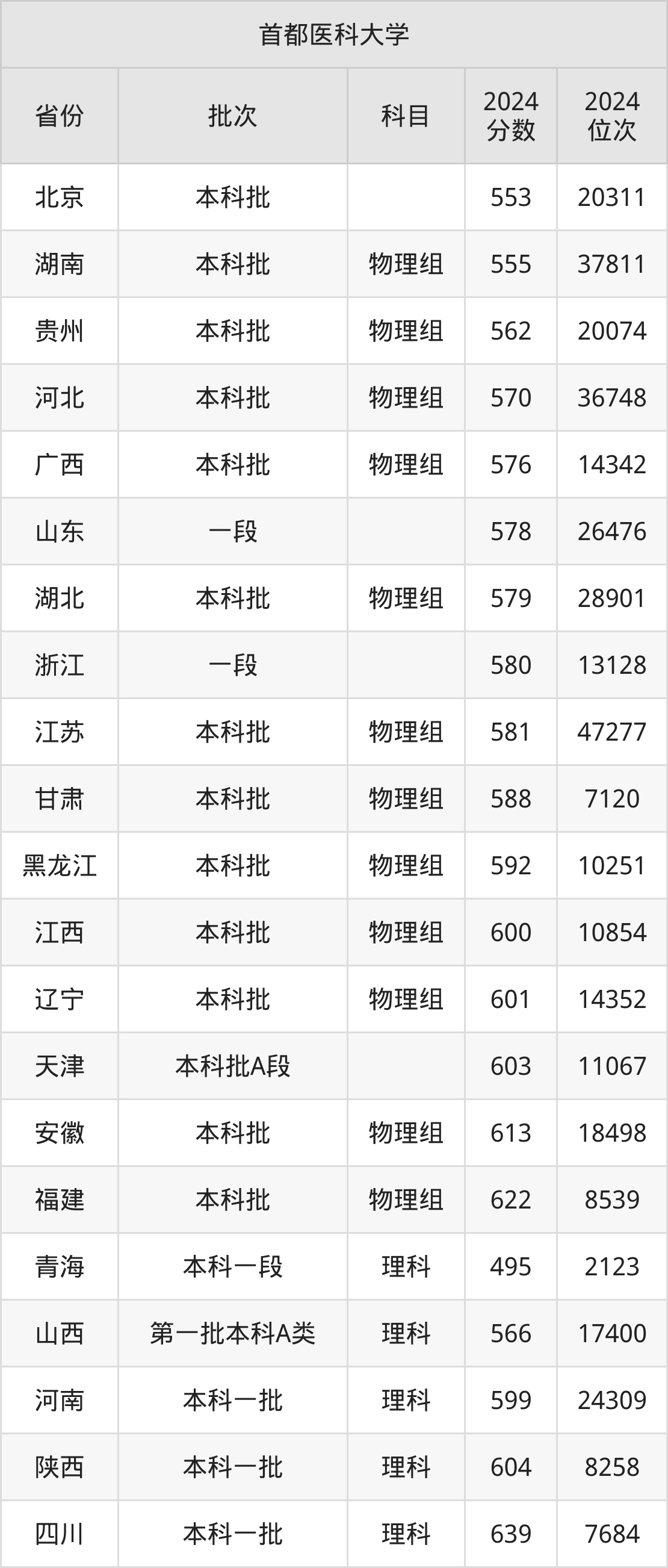 在北京本科批,首都医科大学的最低分是553、最低录取位次是20311名。在湖南本科批物理组,首都医科大学的最低分是555、最低录取位次是37811名。