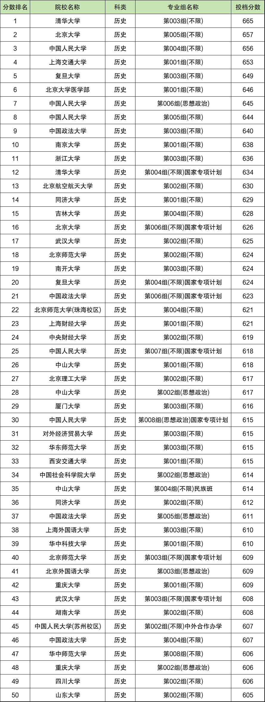 注:受到篇幅限制,以下仅为全国本科院校专业组在黑龙江历史类分数线排名前50强名单,同分数院校按院校名称首字母排序。