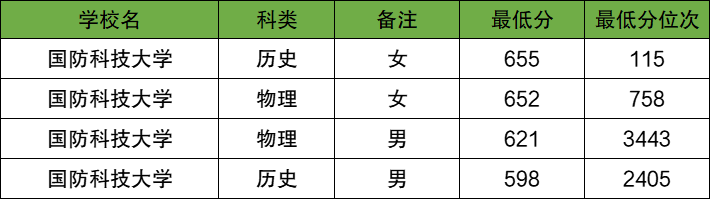 2025年国防科技大学在湖南物理类的最低录取分数线为男生629分,女生649分;国防科技大学在湖南历史类的最低录取分数线为男生599分,女生645分。
