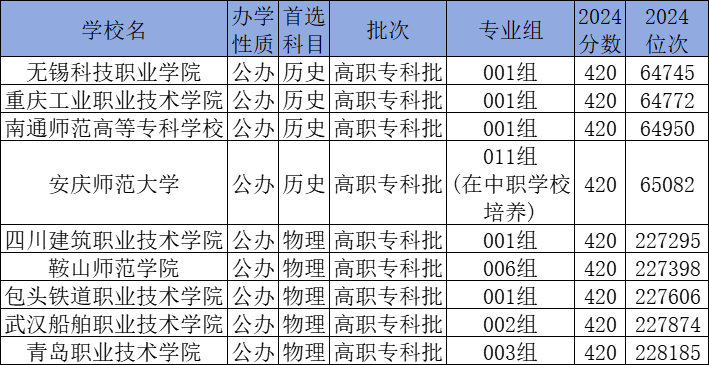 历史类420分能上的有无锡科技职业学院、重庆工业职业技术学院、南通师范高等专科学校、安庆师范大学;物理类420分能上的有四川建筑职业技术学院、鞍山师范学院、包头铁道职业技术学院等。