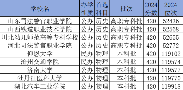 历史类420分能上的有山东司法警官职业学院、山西铁道职业技术学院、川北幼儿师范高等专科学校、河北司法警官职业学院;物理类420分能上的有仰恩大学、沧州交通学院、济南大学、牡丹江医科大学、湖北汽车工业学院。