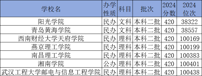 文科420分能上的大学有阳光学院、青岛黄海学院;理科420分能上的大学有西南财经大学天府学院、燕京理工学院、南昌理工学院、湘南学院等。