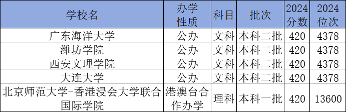 2024年山东420分对应排名:370541名~372408名,因此建议2025年高考位次排名在37万名左右的同学报考这些学校。
