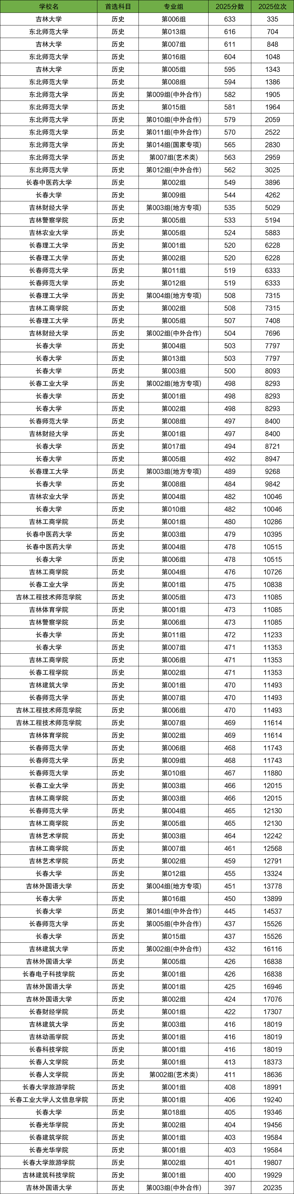 2025年长春本科各大学中,在历史类分数线最高、最难考的院校是吉林大学(第006组),2025年录取分数633分,录取位次335位;