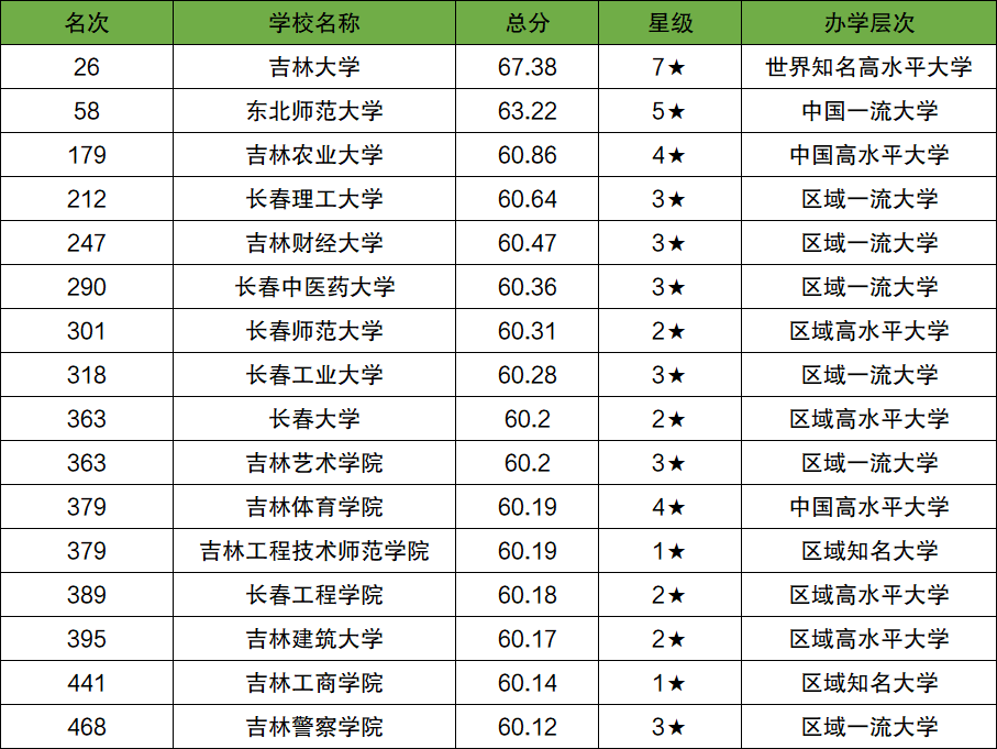 长春各大学排名为:第1名吉林大学、第2名东北师范大学、第3名吉林农业大学等;而长春各大学最低录取分数线则是吉林大学历史类595分、物理类560分,东北师范大学历史类562分、物理类540分等。