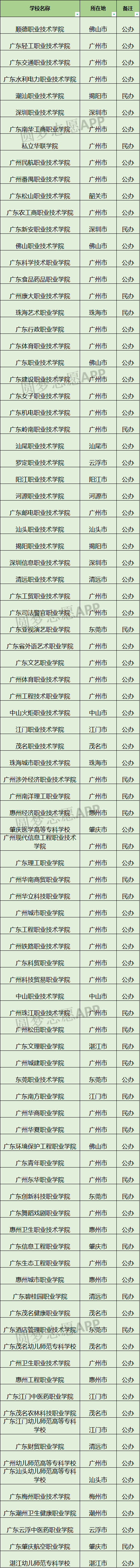 广东所有专科院校有顺德职业技术学院、广东轻工职业技术学院、广东交通职业技术学院、广东水利电力职业技术学院、潮汕职业技术学院等93所。