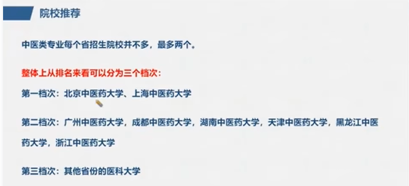 张雪峰老师曾在讲解中医学的相关视频中,也向大家推荐了一部分中医院校,他说中医院校主要分为三个档次,分别如下: