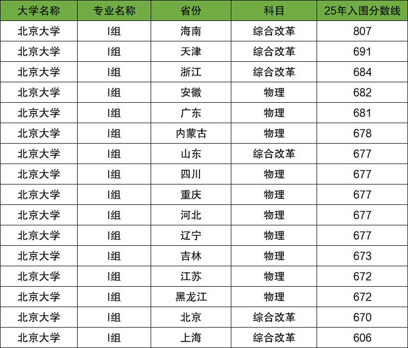 2025年北京大学强基计划入围分数线在606分~807分之间,但是在大部分地区都是在670分~690分之间,具体分数线见下表:
