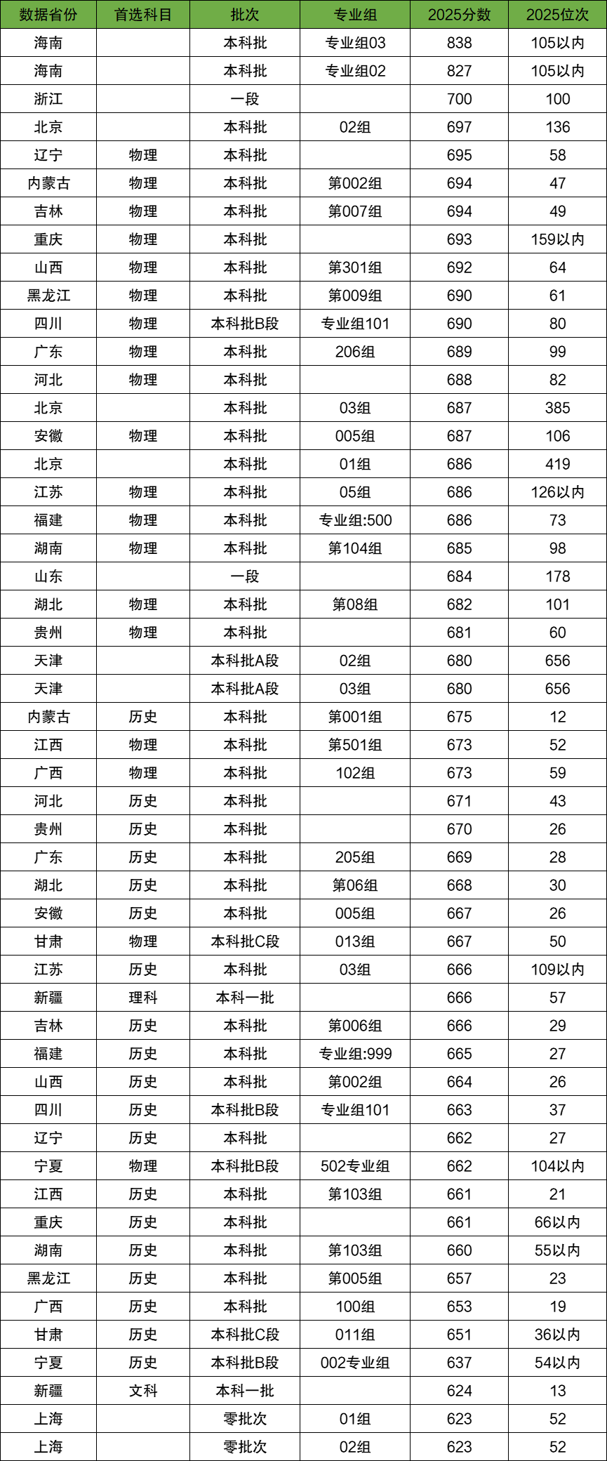 而录取分数线最低的地区是上海,2025年在北京大学在上海的分数线就是623分,位次是52位。
