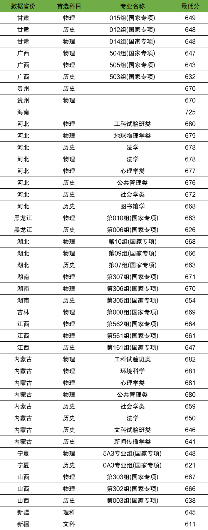 2025年北京大学国家专项计划录取分数线在611分~725分之间,但是在大部分地区都是在650分以上,具体分数线见下表: