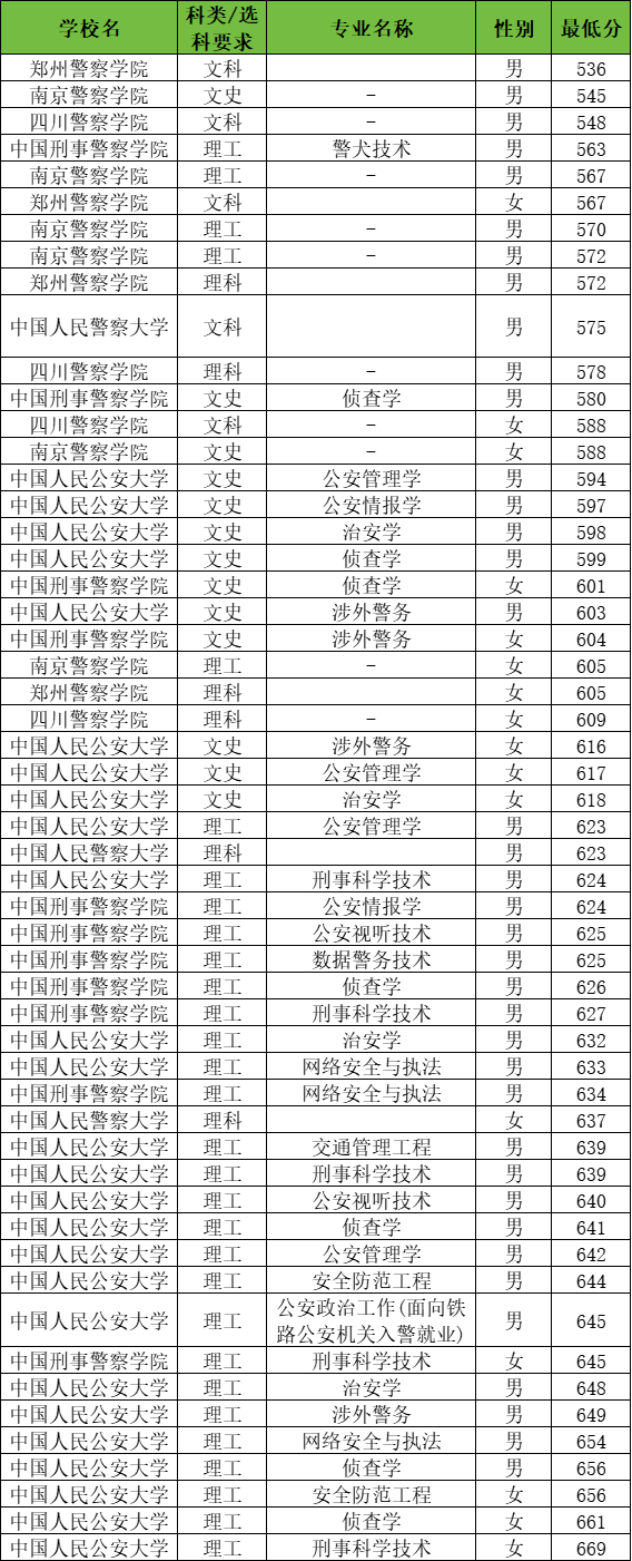 2024年警校录取分数范围在536分~669分之间,其中男生最好考、收分最低的院校是郑州警察学院,学校最低分为536分。女生最好考、收分最低的院校是郑州警察学院,学校最低分为567分。