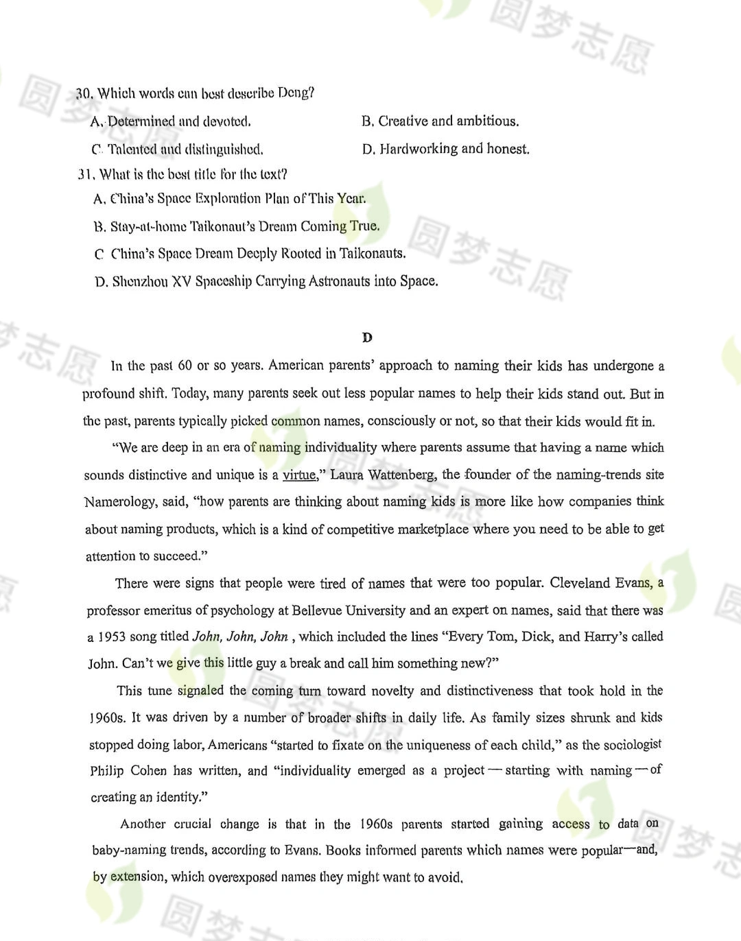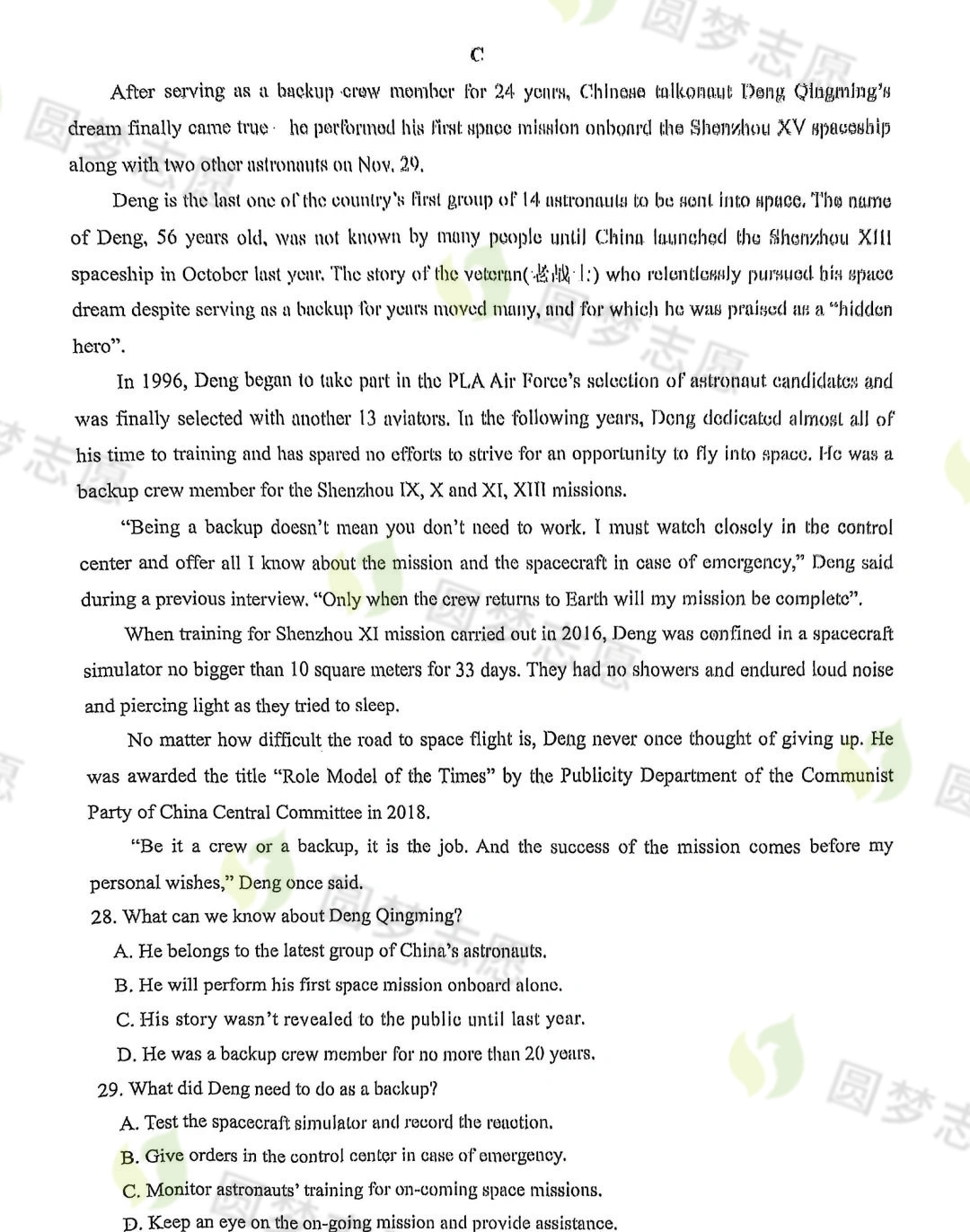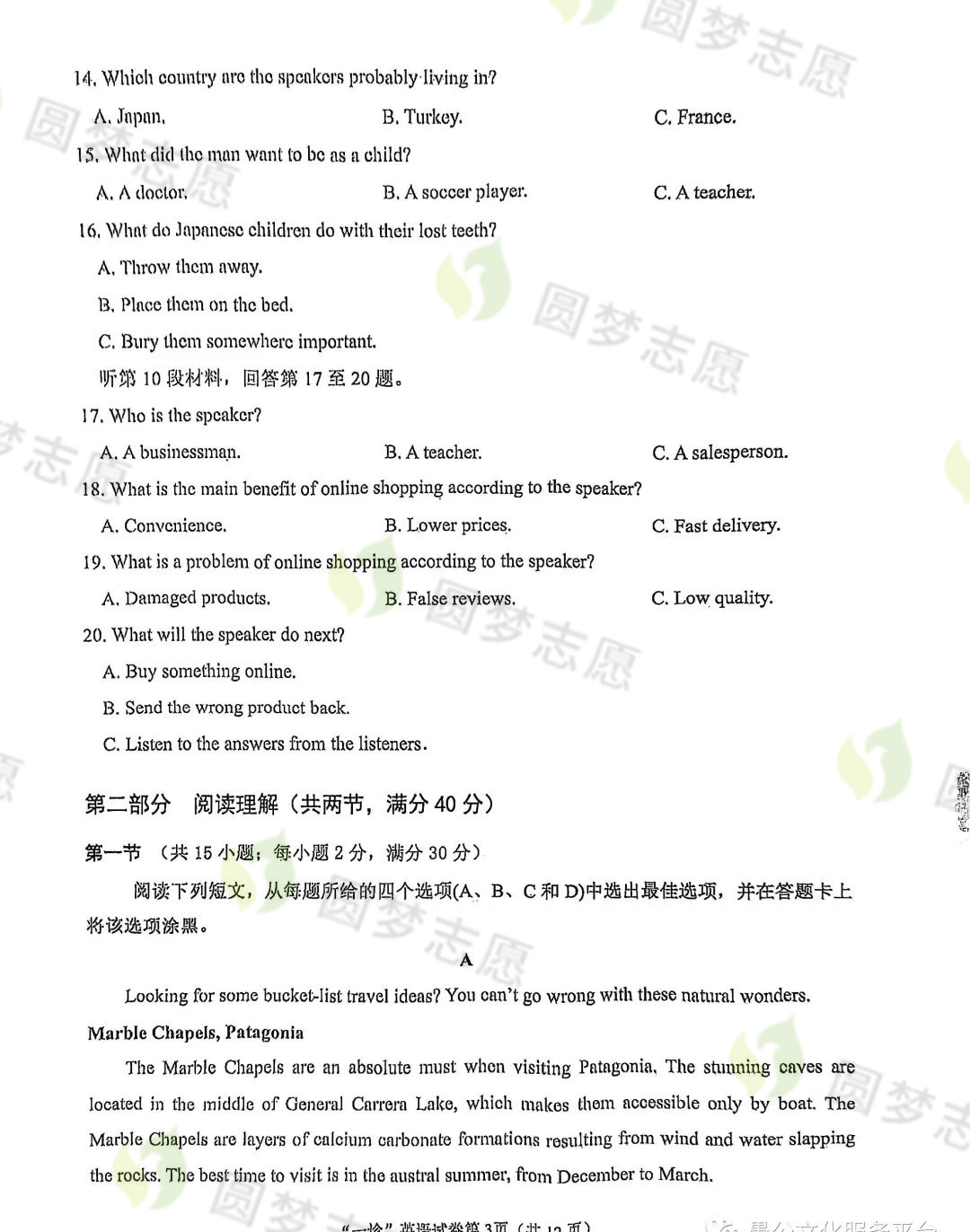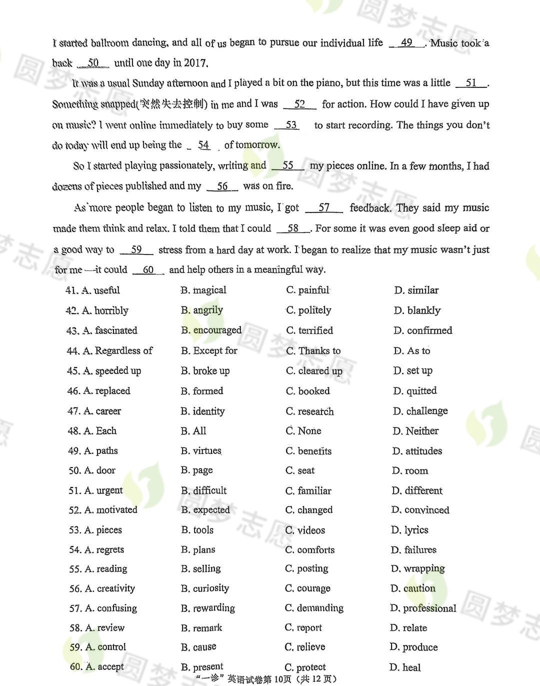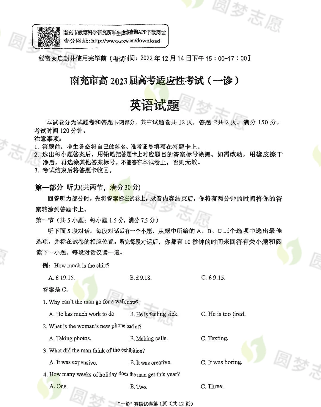 2023南充一诊将于2022年12月13日开考,考试结束后高考100网小编将更新2023南充第一次诊断性考试英语答案及试卷,下文为小编搜集整理的2023南充一诊英语试题及参考答案,供大家参考。