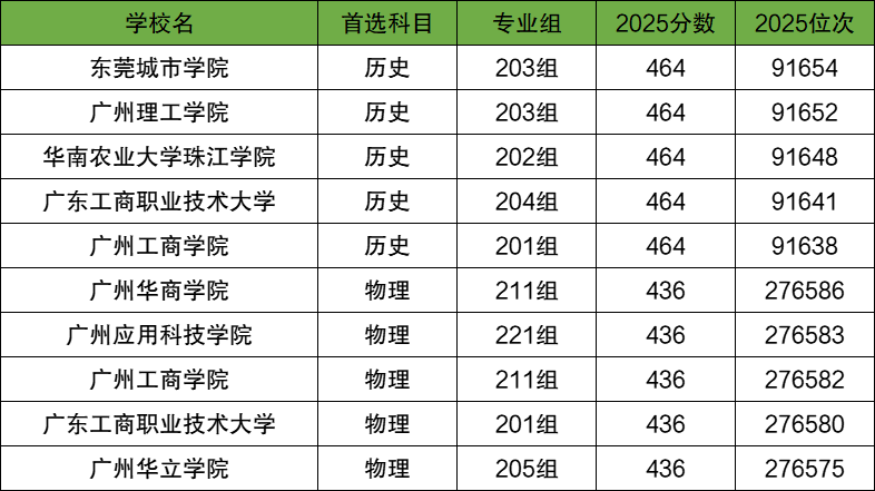 2025年各大学在广东省本科分数线最低的专业组为: