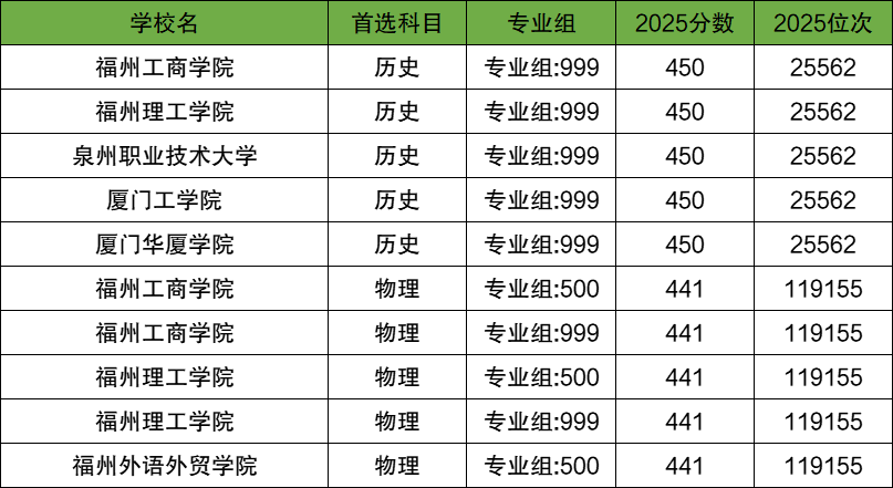 首选物理科目类:福州外语外贸学院专业组:500(441分);首选历史科目类:福州工商学院专业组:999(450分);