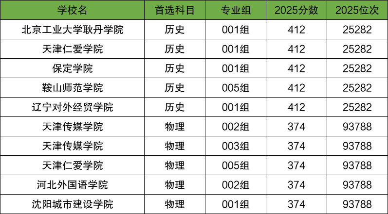 首选物理科目类:天津传媒学院002组(374分);首选历史科目类:北京工业大学耿丹学院001组(412分);