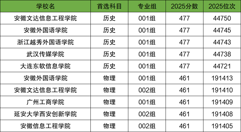 首选物理科目类:安徽外国语学院001组(461分);首选历史科目类:安徽文达信息工程学院001组(477分);