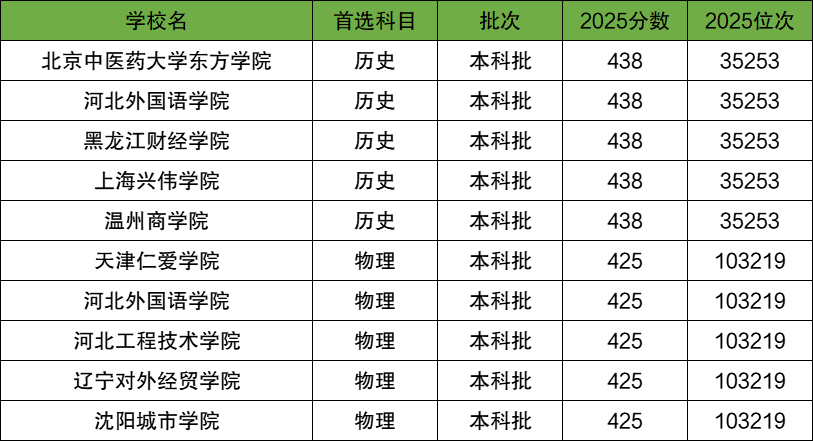 首选历史科目类:北京中医药大学东方学院(438分);首选物理科目类:天津仁爱学院(425分);