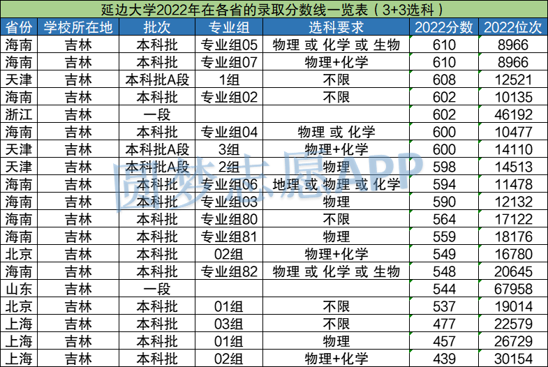 可以看到,延边大学2022年在以下省份的录取分数线中,最高的是海南(05专业组,物理或化学或生物,610分),最低的是上海(02专业组,物理+化学,439分)。