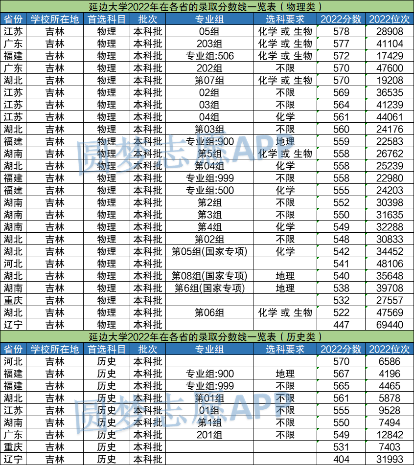 可以看到,延边大学2022年在以下省份的物理类录取分数线中,最高的是江苏省(05专业组,化学或生物,578分)最低的是辽宁447分。