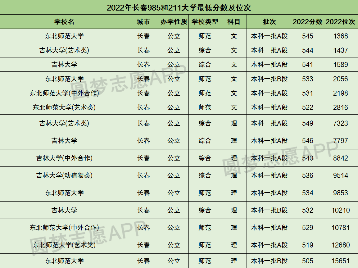 根据圆梦志愿APP提供的数据,小编为大家整理出了长春市内的985大学和211大学在长春市文理科的最低分数线及近一年的录取位次。