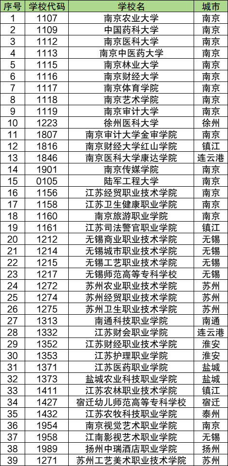 南京农业大学招生代码1107、中国药科大学1109、南京医科大学1112、南京中医药大学1113、南京林业大学1115等。