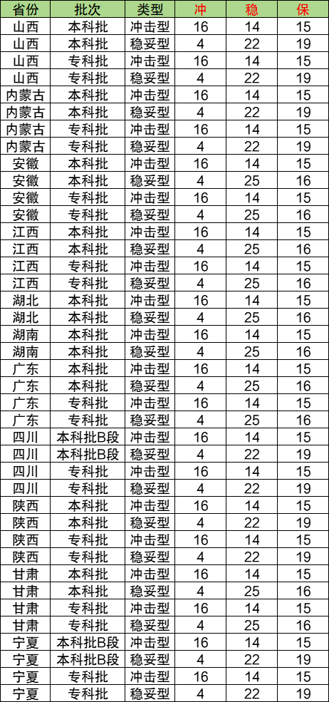 下面是2025年可填报45个志愿地区的冲稳保比例安排一览表,可查阅: