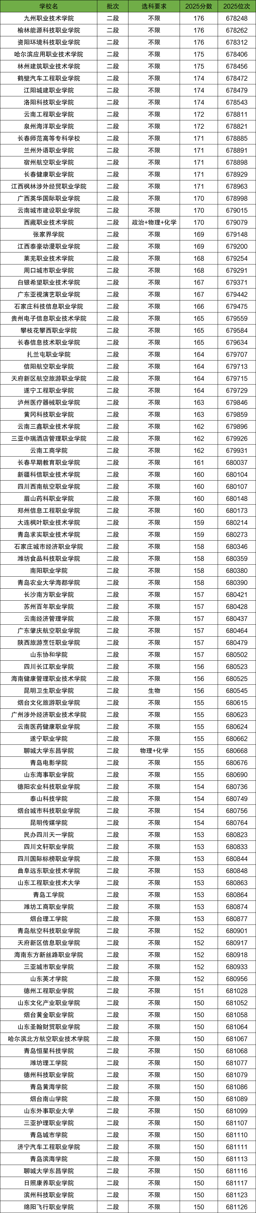 2025山东录取分数线最低的大学基本上以民办学校居多,2025年分数线为150分,这些学校分别是绵阳飞行职业学院(不限)、滨州科技职业学院(不限)、日照康养职业学院(不限)、聊城大学东昌学院(不限)、青岛滨海学院(不限)、济宁汽车工程职业学院(不限)、青岛城市学院(不限)、三亚护理职业学院(不限)等。