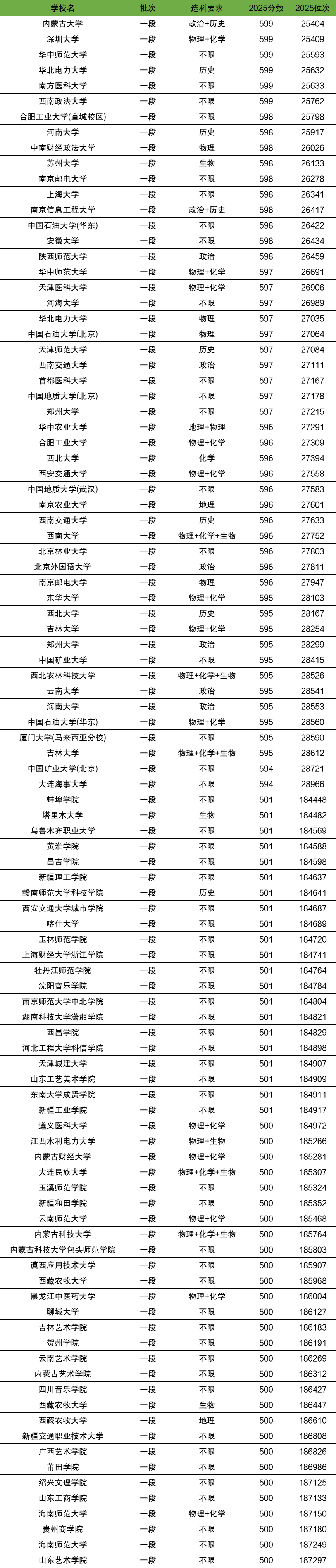 2025山东录取分数线在500~600分的大学数量非常多,这个分数区间基本上都是一些本科大学,其中越靠近六百分,学校越好,例如内蒙古大学(政治+历史)599分、华中师范大学(不限)599分、河南大学(历史)598分、安徽大学(不限)598分,这些都是一些985、211大学。