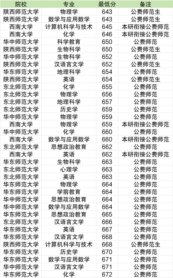最低分的公费师范生院校及专业是陕西师范大学的物理学、数学与应用数学专业,录取分数线为643分。