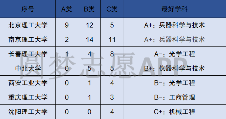 而在软科中的排名情况为:北京理工大学第20名,南京理工大学第36名,长春理工第176名,中北大学第180名,重庆理工大学第209名,西安工业大学第263名,沈阳理工大学第278名;
