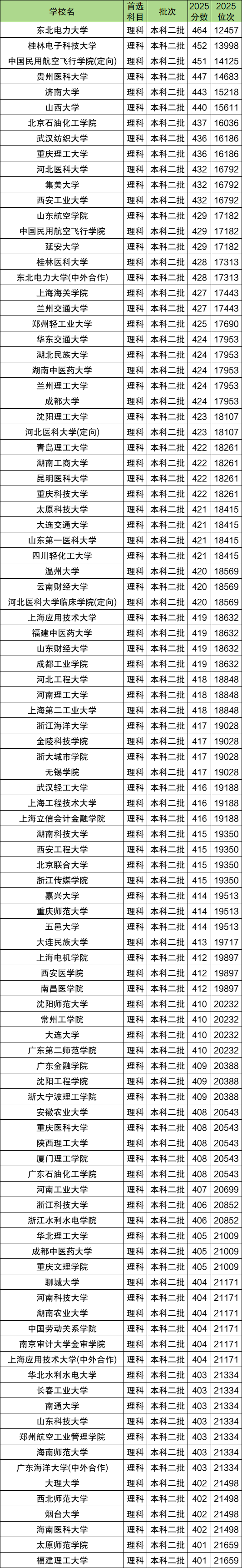 在理科考生中,能考上的二本大学较多,其中所有大学中收分最高的十所二本学校为:东北电力大学、桂林电子科技大学、中国民用航空飞行学院(定向)、贵州医科大学、济南大学、山西大学、北京石油化工学院、武汉纺织大学、重庆理工大学、河北医科大学,2025年最低分在432~464分之间,高出了2025年新疆理科二本批次152~184分,属于理科考生最难考的10所二本大学。
