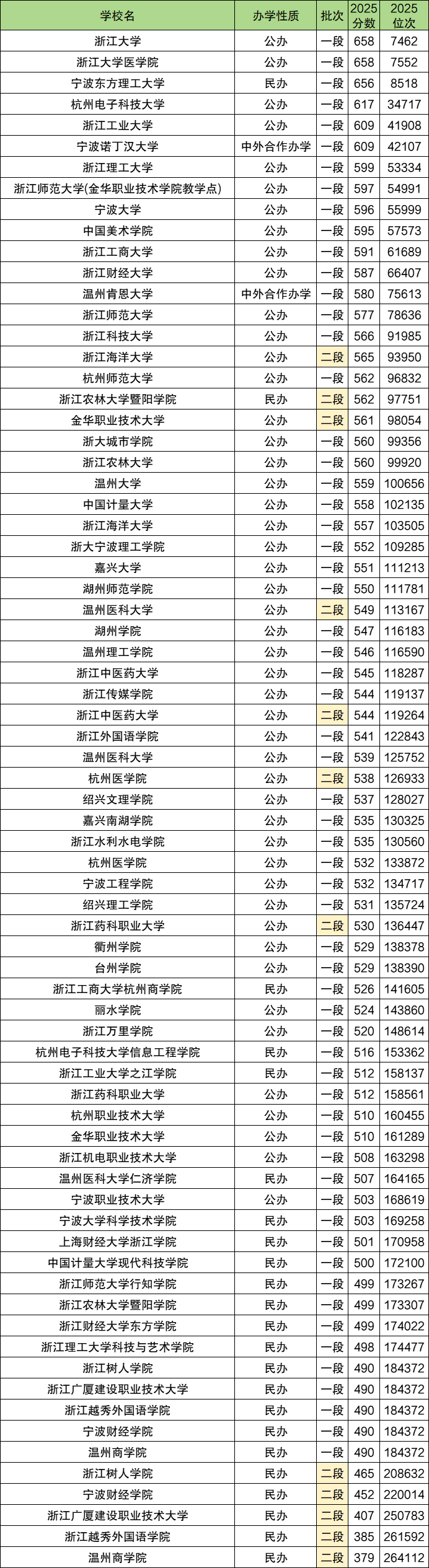 下面是浙江所有大学2025年录取分数一览表: